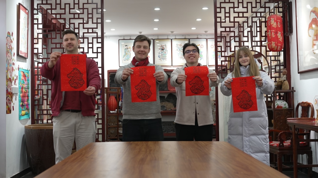 帝漢尼:我?guī)麄兏惺苤袊鴤鹘y(tǒng)文化,有剪紙,我們一起剪了一個“春”字。我還帶他們?nèi)ネ啬戤嫞人⑸夏?,再把紙放上面,用木板刷刷刷,他們覺得很有意思。我們印了一個馬。我們還一起包餃子,我像個老師一樣教他們包餃子。其實我包得不好看,他們包得也不好看,主要是我們包餃子這個過程特別開心。