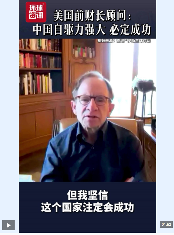 近日,美國(guó)前財(cái)政部長(zhǎng)顧問史蒂文·拉特納在接受美國(guó)播客節(jié)目《查理·羅斯全球?qū)υ挕窌r(shí)表示,近20年來中國(guó)經(jīng)濟(jì)的高速發(fā)展不僅源于經(jīng)濟(jì)因素,更得益于中國(guó)人民追求成功的強(qiáng)大自驅(qū)力。他指出,這種難以用經(jīng)濟(jì)模型量化的拼搏精神深刻塑造了國(guó)家的經(jīng)濟(jì)前景,并認(rèn)為中國(guó)必定會(huì)成功。