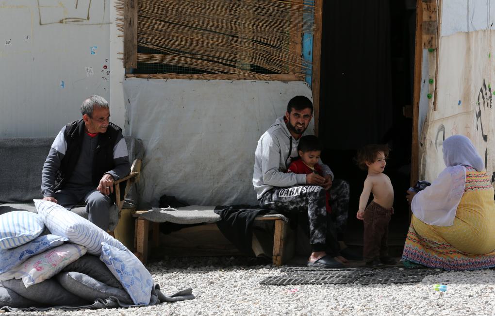 2018年4月12日,在希臘雅典以北約86公里處的里措納難民營,一對夫婦照顧孩子。新華社發(fā)(馬里奧斯·羅洛斯攝)