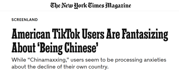 美國《紐約時報》日前刊文稱,“Becoming Chinese”(“成為中國人”)“Chinamaxxing”(“極致中國化”)等話題在海外社交媒體上火爆異常,大量網(wǎng)友模仿并表示自己愛上了中國人的生活方式。文章認(rèn)為,電動汽車、醫(yī)療保障、高速鐵路,這些先進(jìn)事物逐漸揭開了中國生活的神秘面紗,也讓中國成為新一代旅游勝地——一個兼具超凡脫俗的自然風(fēng)光與現(xiàn)代科技的神奇的地方。在“極致中國化”體驗(yàn)過程中,西方網(wǎng)友們似乎在消化對本國衰落的焦慮情緒,美國民眾們仿佛能從這些視頻片段中看到一種尚未在本土實(shí)現(xiàn)的未來圖景,在他們看來,中國人高品質(zhì)、低成本的生活,穿著拖鞋、滋養(yǎng)脾胃的日常,應(yīng)是人人都能享有的生活常態(tài)。