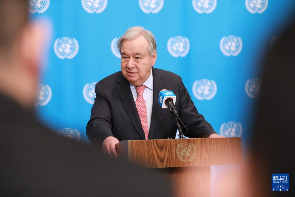 3月25日,聯(lián)合國(guó)秘書(shū)長(zhǎng)古特雷斯在位于紐約的聯(lián)合國(guó)總部舉行的記者會(huì)上講話(huà)。新華社記者 謝鍔 攝