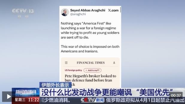 對于美國國防部長赫格塞思的投資經(jīng)紀人曾在美以對伊朗發(fā)起軍事打擊前,嘗試投資防務(wù)類基金一事,伊朗外交部長阿拉格齊3月31日在社交媒體發(fā)文說,沒有什么比為一個外國政權(quán)發(fā)動戰(zhàn)爭、并從被派往前線的年輕士兵之死中牟取暴利,更能嘲諷“美國優(yōu)先”口號的了。