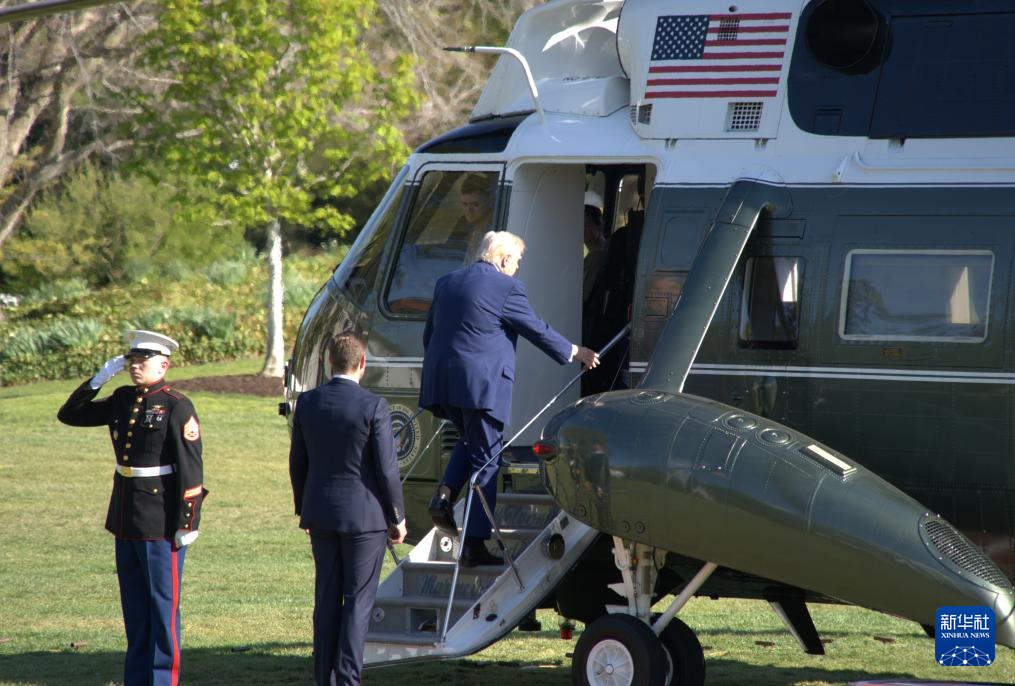 4月10日,美國總統(tǒng)特朗普(右)準(zhǔn)備乘直升機(jī)離開華盛頓白宮。新華社發(fā)(李源清攝)