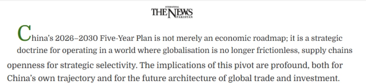 巴基斯坦《國際新聞報(bào)》近日刊文稱,“十五五”規(guī)劃綱要對中國而言不僅僅是一份經(jīng)濟(jì)路線圖,更是一項(xiàng)戰(zhàn)略方針。它不僅關(guān)乎中國自身的發(fā)展軌跡,也影響未來全球貿(mào)易和投資格局。