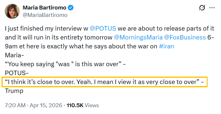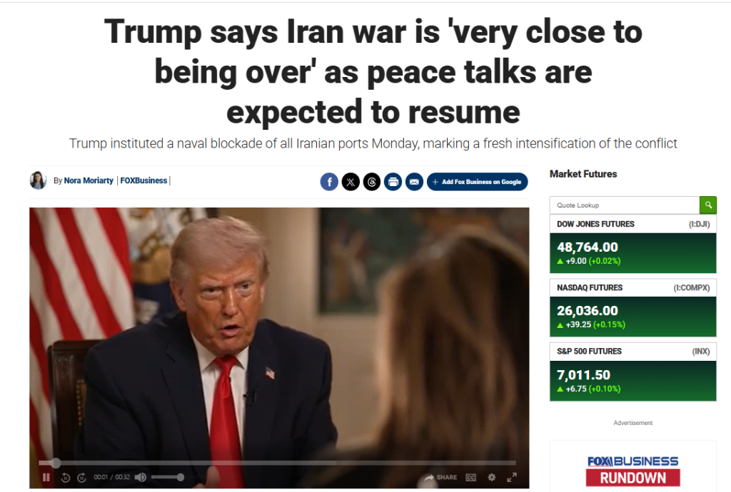 特朗普當(dāng)天接受??怂剐侣?lì)l道記者采訪。記者問,為什么“你一直在說‘戰(zhàn)爭結(jié)束了’”。特朗普回答說:“我覺得(伊朗戰(zhàn)事)已經(jīng)接近結(jié)束了。是的,我是說,我認(rèn)為已經(jīng)非常接近結(jié)束了。”