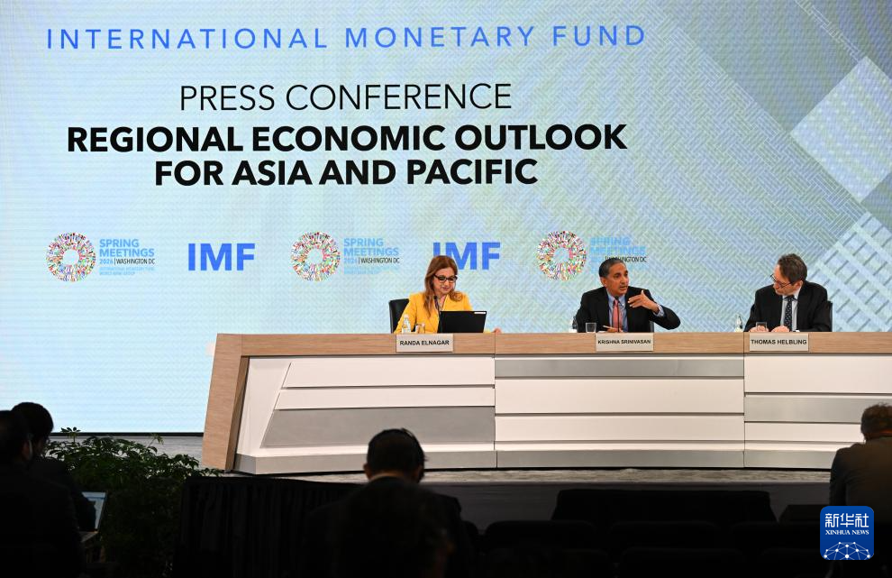 4月16日,在美國華盛頓,國際貨幣基金組織(IMF)亞太部主任斯里尼瓦桑(中)在新聞發(fā)布會上講話。新華社記者 李睿 攝