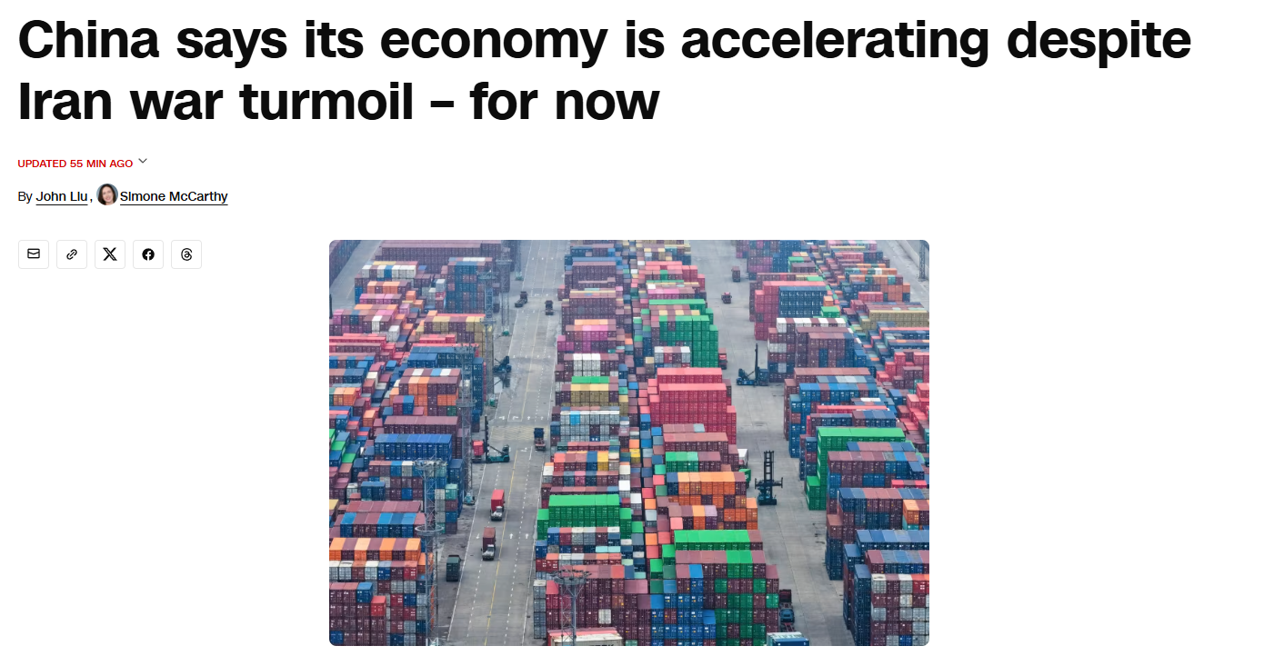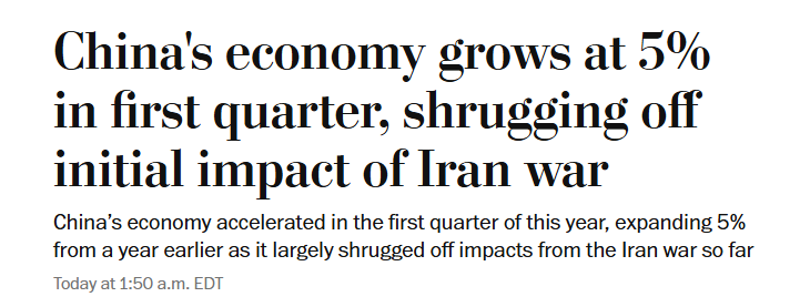 美國《華盛頓郵報》指出,中國今年一季度經(jīng)濟(jì)數(shù)據(jù)優(yōu)于經(jīng)濟(jì)學(xué)家預(yù)期,增速也高于去年四季度。報道認(rèn)為,雖然中東局勢升級推高能源價格,加劇全球通脹壓力并拖累世界經(jīng)濟(jì)增長,但經(jīng)濟(jì)學(xué)家普遍預(yù)計,中國經(jīng)濟(jì)目前仍有能力應(yīng)對這一沖擊。