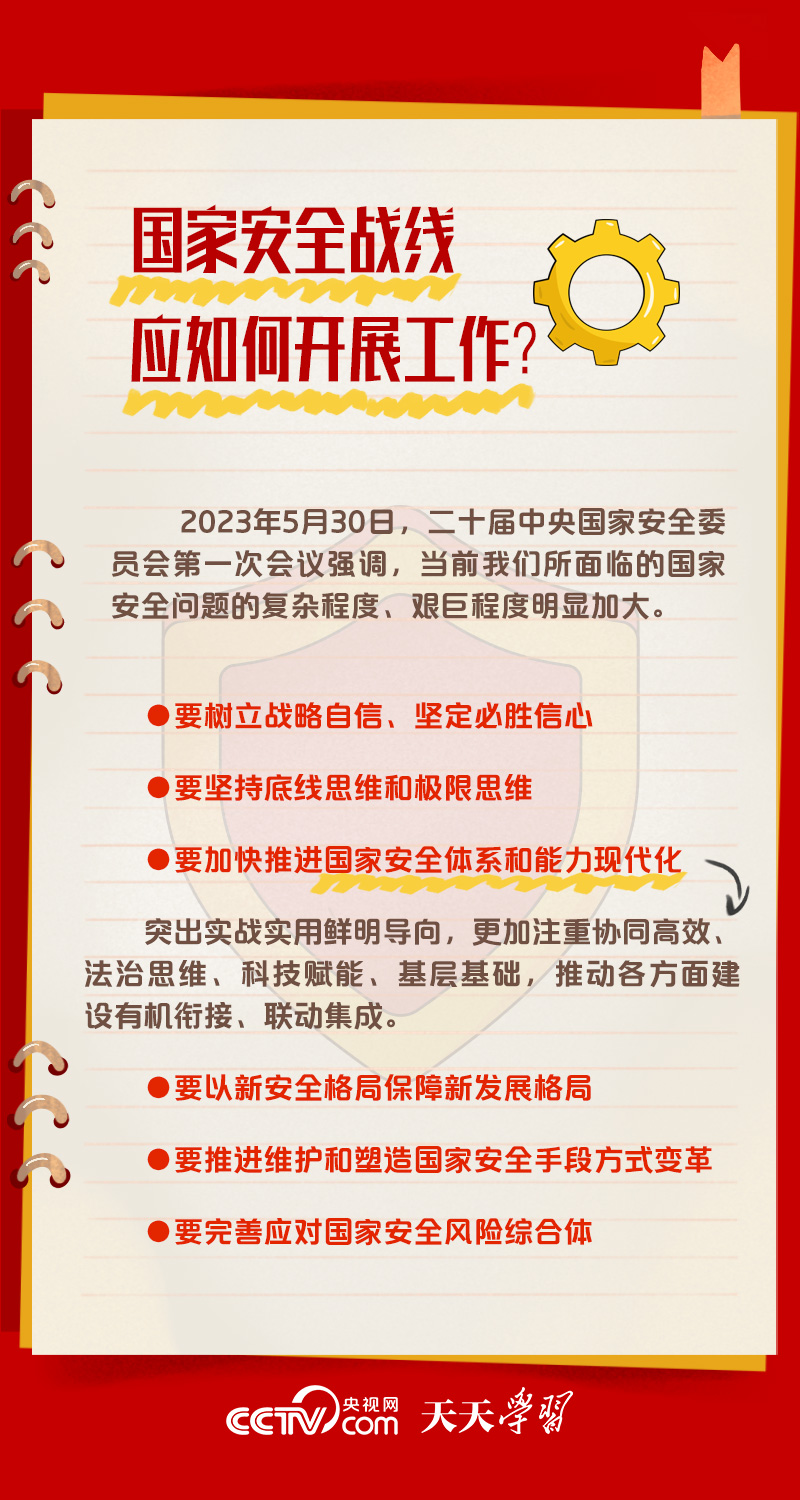 5月30日,習近平總書記主持召開二十屆中央國家安全委員會第一次會議時強調,要全面貫徹黨的二十大精神,深刻認識國家安全面臨的復雜嚴峻形勢,正確把握重大國家安全問題,加快推進國家安全體系和能力現(xiàn)代化,以新安全格局保障新發(fā)展格局,努力開創(chuàng)國家安全工作新局面。