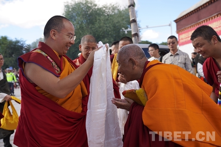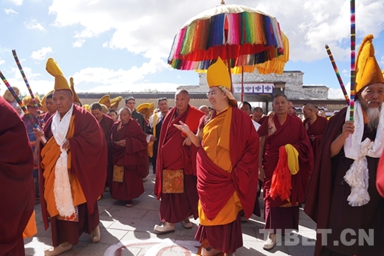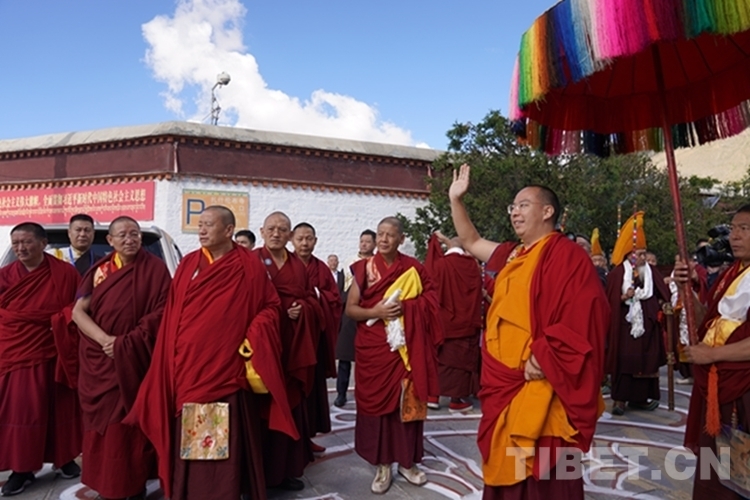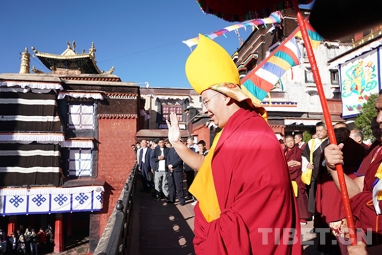 班禪一行順利抵達(dá)后,現(xiàn)場桑煙繚繞、法號長鳴,扎什倫布寺高僧代表向班禪敬獻(xiàn)哈達(dá),班禪向僧眾及在此等候的信眾們揮手致意。隨后,班禪在手持黃傘、香爐的高僧引領(lǐng)下徐徐而行,經(jīng)多加大院進(jìn)入措欽大殿。
