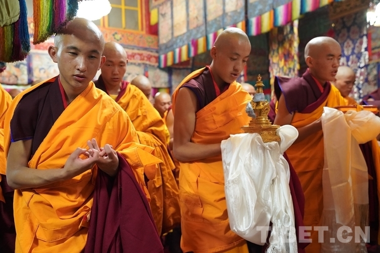 當(dāng)天清晨,扎什倫布寺桑煙繚繞、法號聲聲,28 位受戒的年輕僧人帶著新制袈裟,迎著朝霞依次走向拉讓殿等待班禪授戒這一神圣時刻的到來。8時許,在手持黃傘、香爐和吹嗩吶的高僧護送引領(lǐng)下班禪緩緩步入拉讓殿,并與在場僧眾集體誦經(jīng)。誦經(jīng)儀式結(jié)束后,班禪就坐于拉讓殿寶座,4名高僧大德作為授戒眾,開始為僧人閉門授戒、剃度、賜法名、摸頂。此時,受戒僧人一一入座,兩手在胸前交叉,聽班禪引證經(jīng)典告誡,并宣誓嚴守戒律。