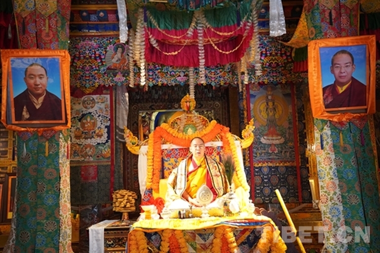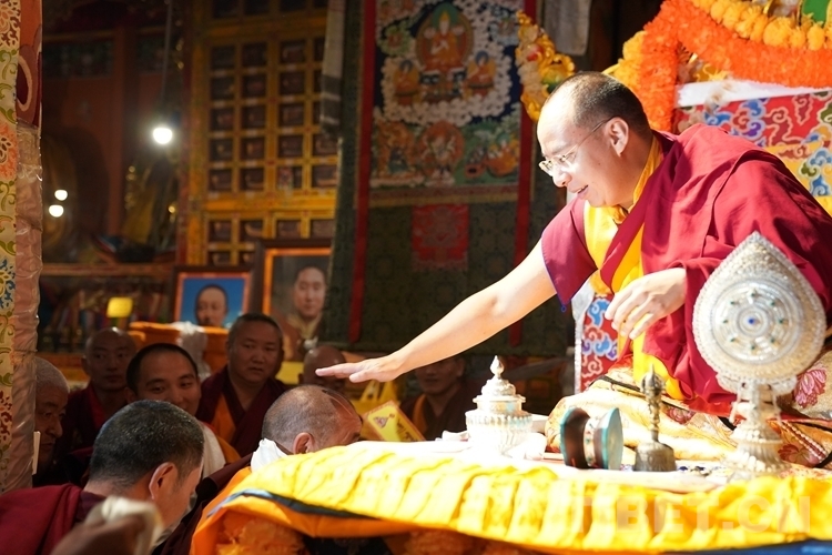 當日12時許,班禪一行抵達日吾其鄉(xiāng),班禪笑容慈和地一一為等候在寺廟前的信教群眾摸頂,并向表演迥巴藏戲的信教群眾揮手致意。隨后,手持香爐的高僧和吹嗩吶的僧人引路,在手持黃傘的高僧護送下,班禪緩步進入主殿,朝拜大威德金剛拉康,參觀石刻、擦擦文物陳列室后登上大殿寶座,向寺廟僧眾傳授《勝道啟門頌》,為僧眾摸頂。