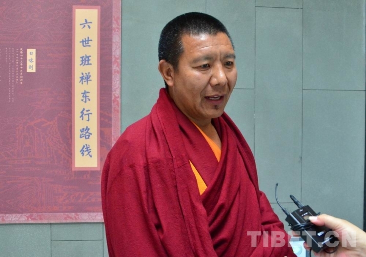 圖為扎什倫布寺管委會(huì)副主任多布瓊在展覽現(xiàn)場(chǎng)接受專訪 攝影:歐帆