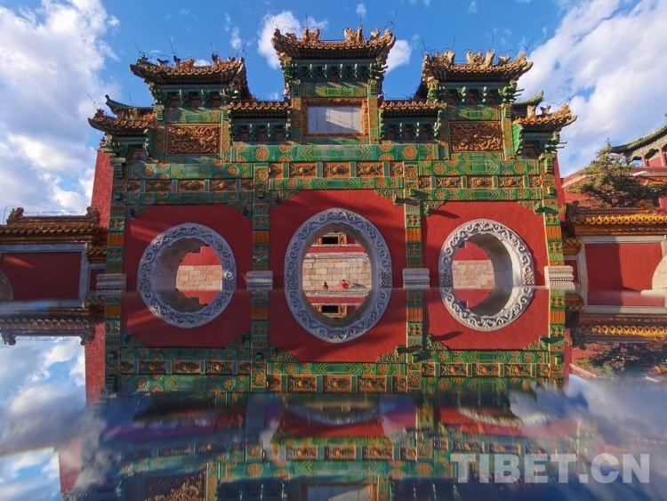 圖為須彌福壽之廟主體建筑大紅臺(tái)前象征神權(quán)、皇權(quán)的琉璃牌坊。能通過它的只有皇帝、親王、郡王、貝勒、貝子及三品以上臺(tái)吉 攝影:歐帆