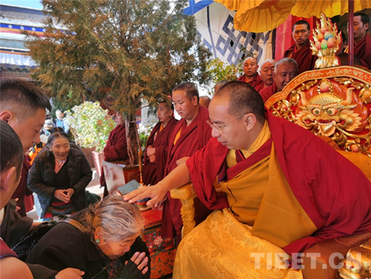 中國西藏網(wǎng)訊 11月13日至14日,全國政協(xié)常委、中國佛教協(xié)會副會長、中國佛協(xié)西藏分會會長班禪額爾德尼?確吉杰布在西藏日喀則市扎什倫布寺多加大院為信教群眾摸頂賜福,這是近年來規(guī)模最大的一次班禪摸頂賜?;顒?dòng)。圖為班禪摸頂賜福 攝影:王淑(中國西藏網(wǎng) 記者/王淑 賈華加)