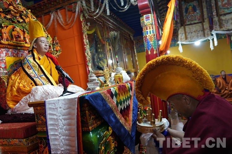 當日的拉定寺裝飾一新,班禪一行抵達后,現(xiàn)場法號齊鳴、法螺合奏,倫珠晉巴和僧眾在寺廟前舉行了隆重的歡迎儀式。隨后,在手持香爐、寶傘高僧的引導(dǎo)護送下,班禪步入主殿上寶座,向寺廟僧眾傳授《三主要道論》,為僧眾摸頂賜福、發(fā)放布施。