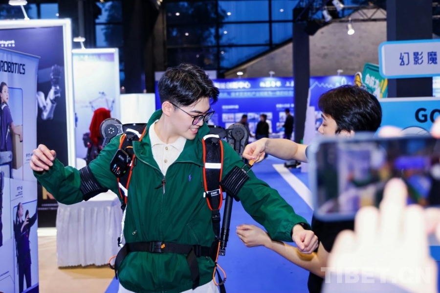 圖為游客們正在體驗能夠輔助提升運動表現(xiàn)的智能穿戴設(shè)備。
