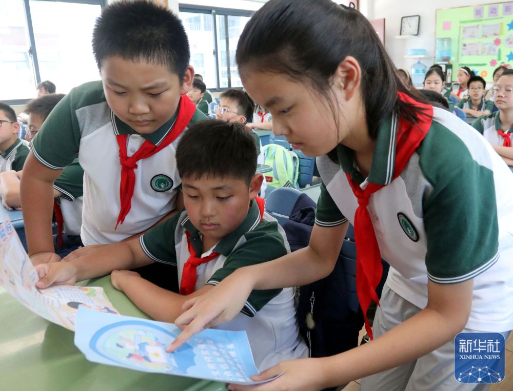 9月15日,在山東省青島市市北區(qū)延安二路小學(xué)開(kāi)展的網(wǎng)絡(luò)安全教育主題活動(dòng)上,民警為學(xué)生們講解防范電信詐騙小常識(shí)。新華社發(fā)(王海濱攝)
