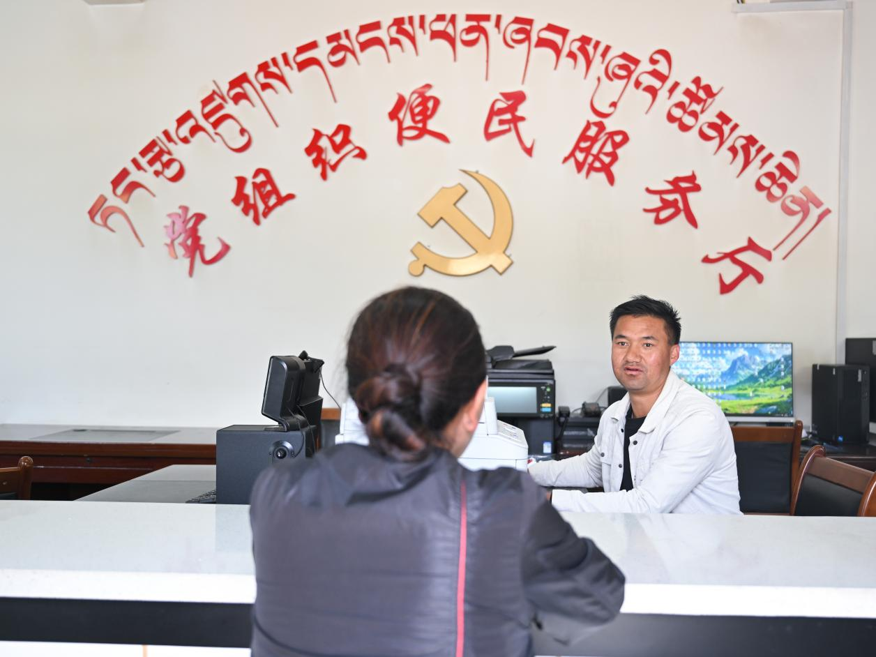 4月13日,在才堂村黨組織便民服務廳,工作人員正在為村民講解醫(yī)療保障政策。新華社記者 張龍 攝