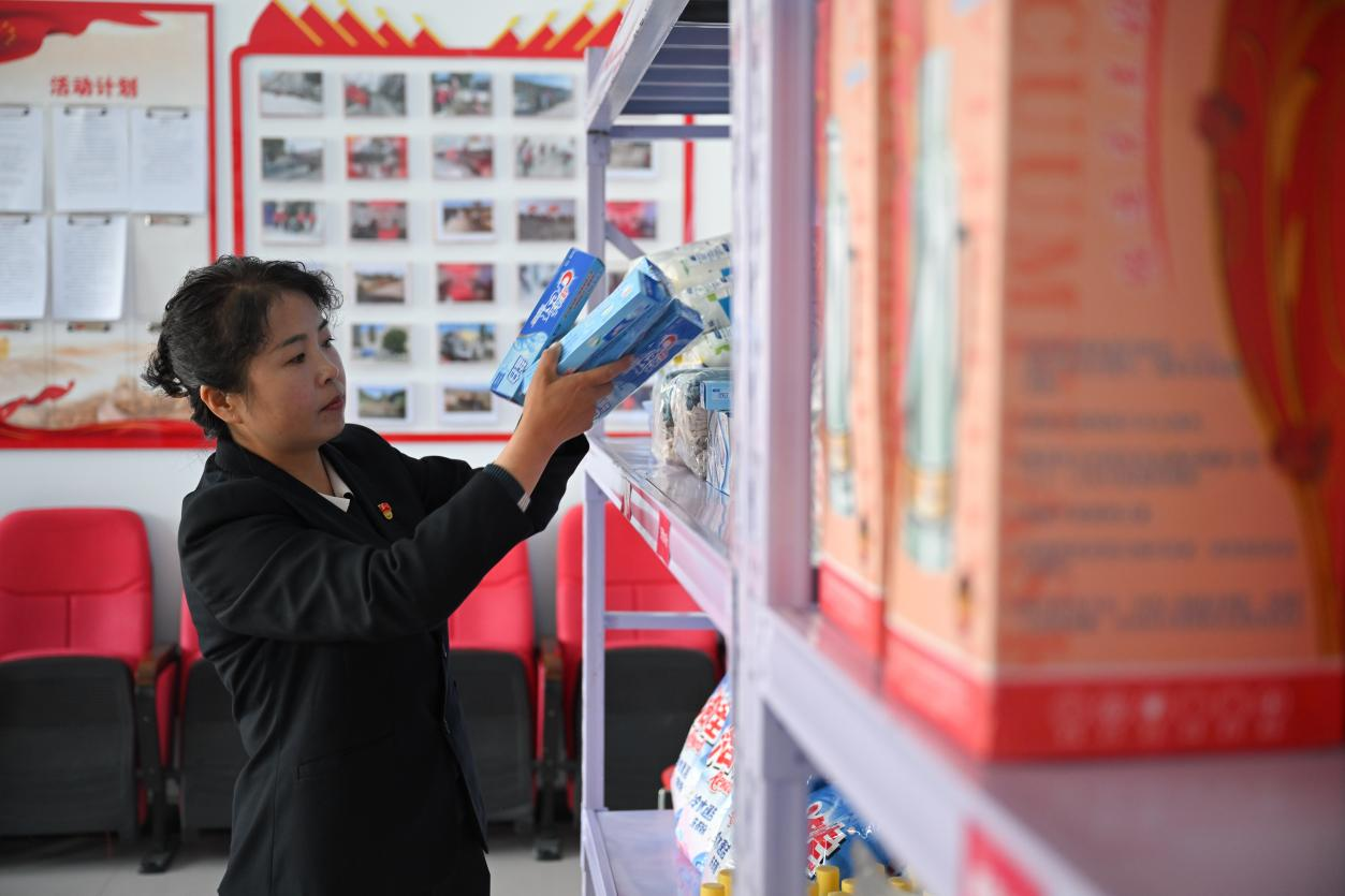 4月13日,才堂村黨支部書記胡海英正在整理“積分超市”的獎品。新華社記者 張龍 攝