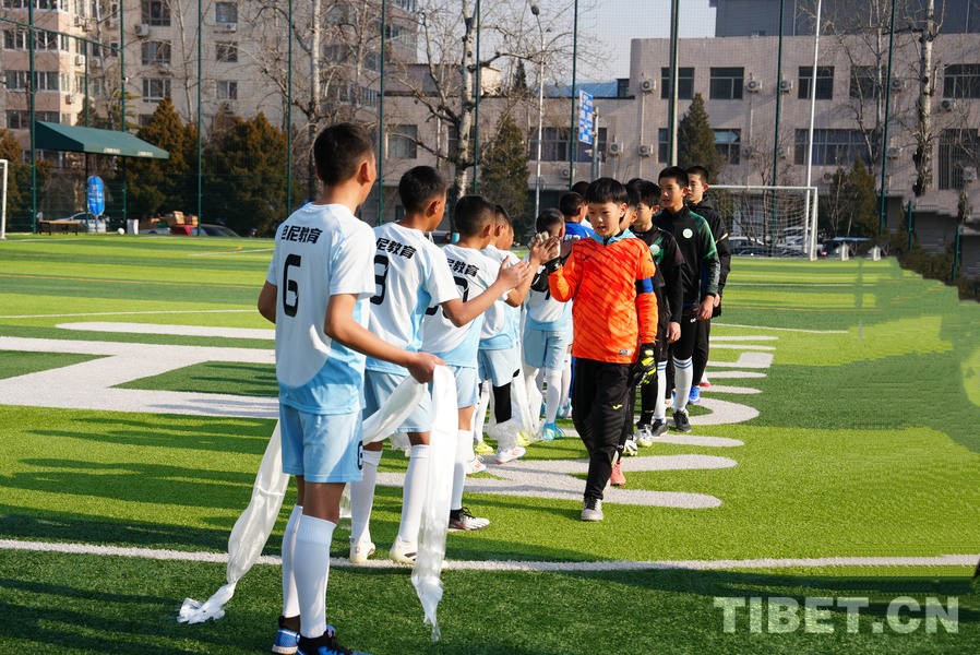 2025年12月29日,京藏少年開(kāi)展足球聯(lián)誼賽,賽前擊掌,西藏青少年向?qū)Ψ角騿T獻(xiàn)哈達(dá)。攝影:宋俊