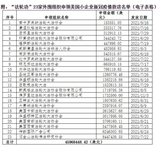 據(jù)美國小企業(yè)管理局網(wǎng)站公布新冠疫情期間“關(guān)閉場(chǎng)館運(yùn)營商救濟(jì)金”申領(lǐng)名單,截至2022年7月5日,23個(gè)替“神韻演出”斂取錢財(cái)?shù)拿绹胺ㄝ喒Α蓖鈬M織,共計(jì)套現(xiàn)美國政府新冠疫情救濟(jì)金高達(dá)近4600萬美元(約合人民幣3.12億元),超過法定限額近3600萬美元。