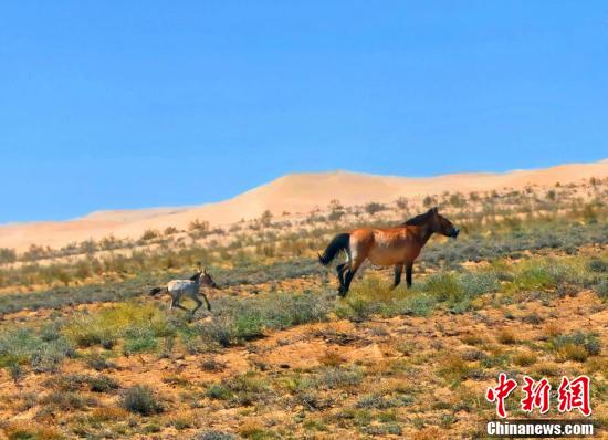 新出生的小馬駒跟隨母親在戈壁上行走。