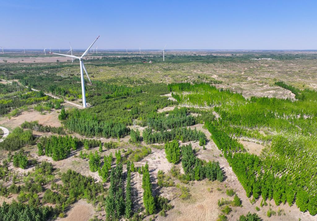 這是在內(nèi)蒙古通遼市科爾沁沙地“雙百萬畝”綜合治理工程努古斯臺項(xiàng)目區(qū)拍攝的風(fēng)力發(fā)電機(jī)組(2024年5月15日攝,無人機(jī)照片)。新華社記者 連振 攝