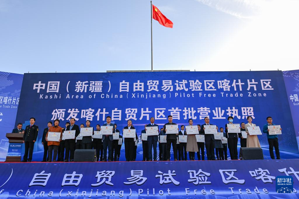 2023年11月11日,在中國(新疆)自由貿(mào)易試驗區(qū)喀什片區(qū)揭牌儀式現(xiàn)場,首批入駐自貿(mào)片區(qū)的經(jīng)營主體獲頒營業(yè)執(zhí)照。新華社記者 丁磊 攝