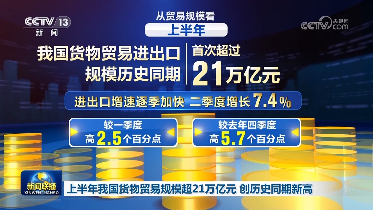 從貿(mào)易規(guī)???,上半年,我國(guó)貨物貿(mào)易進(jìn)出口規(guī)模歷史同期首次超過21萬億元。進(jìn)出口增速逐季加快,二季度增長(zhǎng)7.4%,較一季度和去年四季度分別高2.5個(gè)、5.7個(gè)百分點(diǎn),貨物貿(mào)易進(jìn)出口質(zhì)量持續(xù)提升、規(guī)模較快增長(zhǎng)。