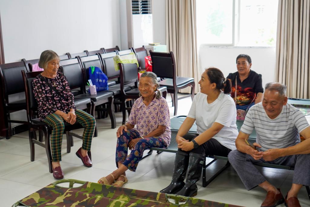 7月30日,富強(qiáng)村村委會(huì)辦公點(diǎn)內(nèi),村黨支部書記謝小紅(右二)和被安置的群眾聊天,了解他們的困難和需求。新華社記者 劉潺 攝