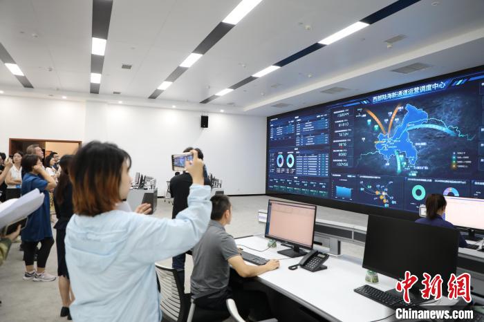 走進陸海新通道重慶無水港,在辦公大樓的運營調度中心里,大屏幕上實時顯示著西部陸海新通道運營調度的各項數據,包括班列訂單、開行量、貨值、輻射范圍等。這里是西部陸海新通道的運行“大腦”。
