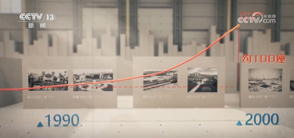 追溯歷史,將人民廣場的建設與時間線關聯,我們發(fā)現了全國人民廣場建設的兩個重要時間節(jié)點:在90年代,隨著城鎮(zhèn)化的步伐,更多的廣場滿足了人們對公共空間的新需求,大約有100座人民廣場在這十年間建成。2013年左右,一股新的建設浪潮出現在小型縣城,尤其是在剛剛擺脫貧困的地區(qū)興起,人民廣場的增量又與脫貧攻堅的進程同步見證了一塊塊土地從貧瘠到繁榮的動人變遷。