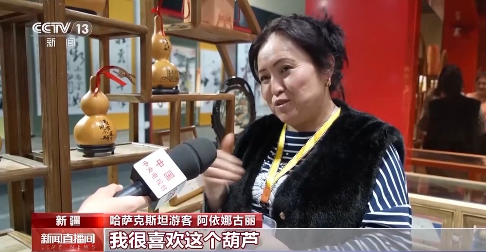 走進(jìn)霍爾果斯中國(guó)文化館,中國(guó)書法、絲綢、刺繡……讓各國(guó)游客駐足欣賞,展架上,一個(gè)個(gè)精美別致的葫蘆吸引了大家的注意,用烙鐵在葫蘆上烙下精美的圖樣,這在很多游客眼里還是第一次見。