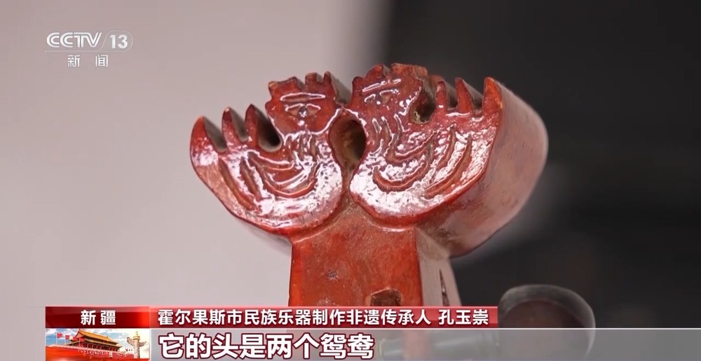 霍爾果斯市民族樂器制作非遺傳承人 孔玉崇:鴛鴦是很美好的,它有兩個(gè)腹板,也可以互為背板。它的頭是兩個(gè)鴛鴦,在一個(gè)腿上可以彈,坐著也可以拉,很方便。你帶著這么一把琴就等于帶了兩把琴,因?yàn)樗囊灿?,彈的也有?/p>