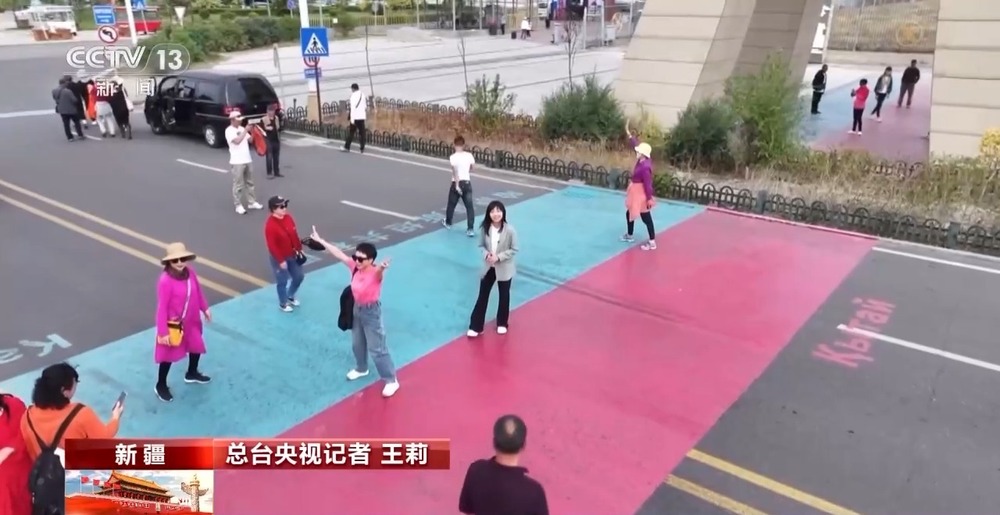 總臺(tái)央視記者 王莉:進(jìn)入合作中心,中哈連接通道處的“一步跨兩國(guó)”,絕對(duì)是游客的打卡首選地。紅色和藍(lán)色交界的地方,就是國(guó)界線了,線的一側(cè)紅色區(qū)域代表中國(guó),藍(lán)色區(qū)域代表哈薩克斯坦。前一秒還在中國(guó),只要一腳邁過分界線,就能一秒“出國(guó)”,來到哈薩克斯坦。