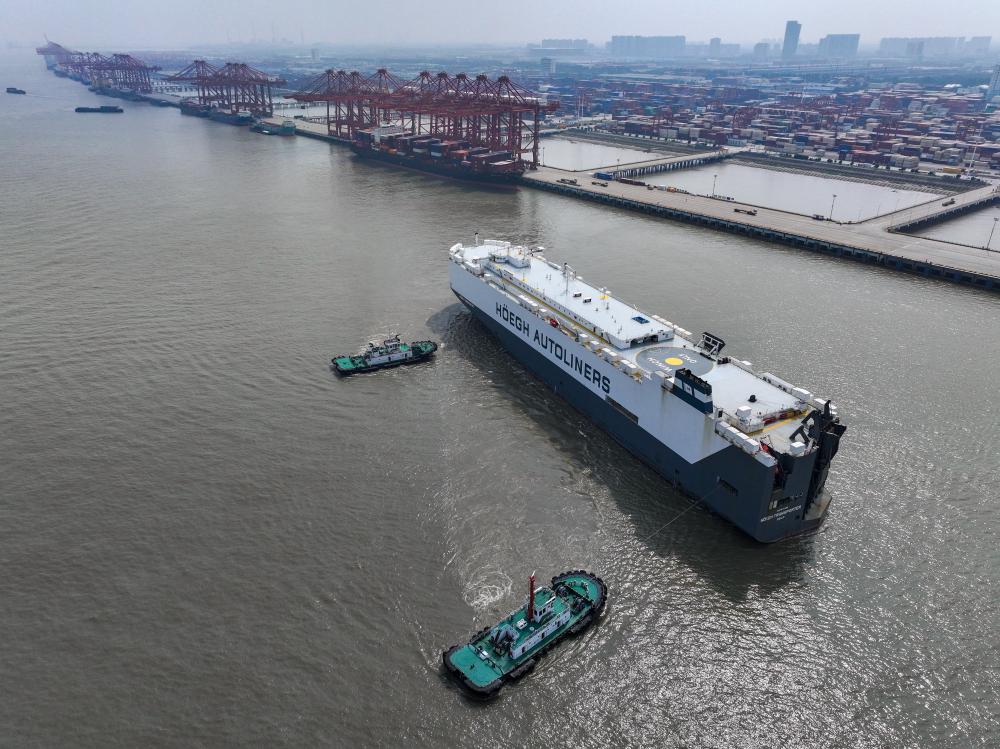 一艘貨輪駛離江蘇省蘇州港太倉(cāng)港區(qū)集裝箱碼頭(無(wú)人機(jī)照片,10月10日攝)。新華社記者 李博 攝