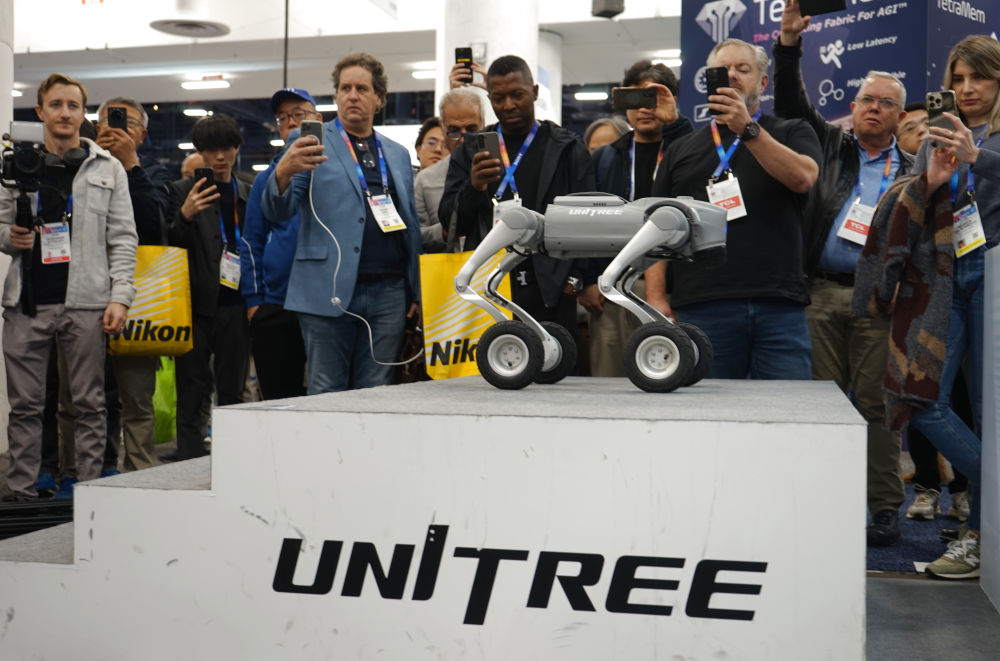 1月8日,在美國拉斯維加斯,人們在中國企業(yè)宇樹科技的展區(qū)觀看機器狗展示。新華社發(fā)(曾慧攝)