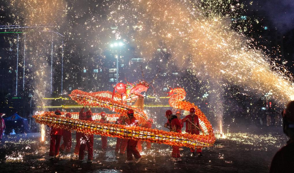 2月11日晚,人們在臺(tái)江縣參加“舞龍噓花”活動(dòng)。新華社記者 陶亮 攝