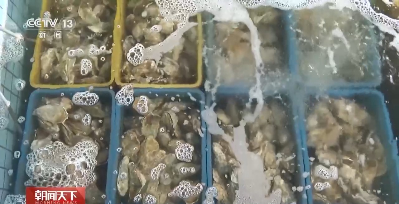總臺(tái)央視記者 李嘯虎:在國(guó)家農(nóng)業(yè)產(chǎn)業(yè)強(qiáng)鎮(zhèn)廣東陽(yáng)西程村鎮(zhèn),“五一”期間,這里的生蠔迎來(lái)大量上市。這片占地六萬(wàn)多畝的生蠔養(yǎng)殖基地里,養(yǎng)殖戶(hù)正從水下收獲一排排成熟的生蠔,40多萬(wàn)箱新捕撈的海鮮正從這里走上百姓的節(jié)日餐桌。