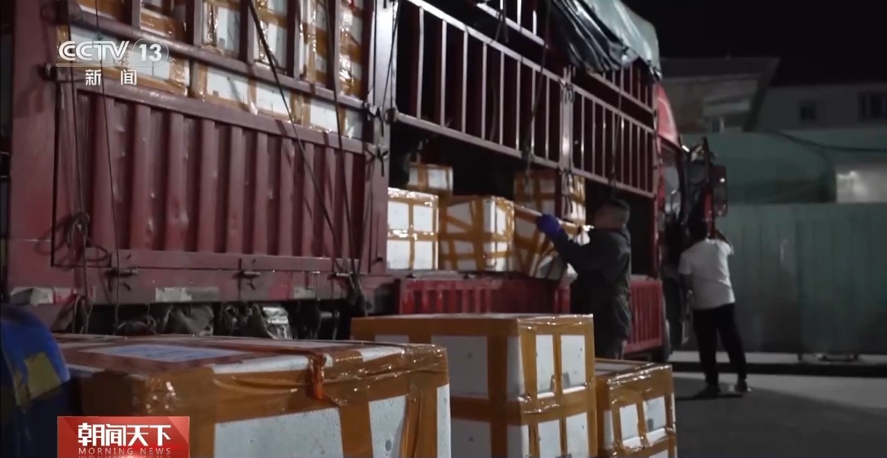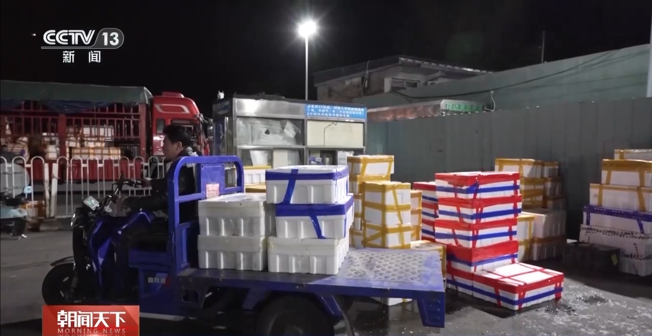 總臺(tái)央視記者 張琪:在北京大紅門(mén)京深海鮮批發(fā)市場(chǎng),凌晨2點(diǎn)半,進(jìn)場(chǎng)的車(chē)輛絡(luò)繹不絕,物流停車(chē)場(chǎng)也停滿了正在卸貨的貨車(chē)。