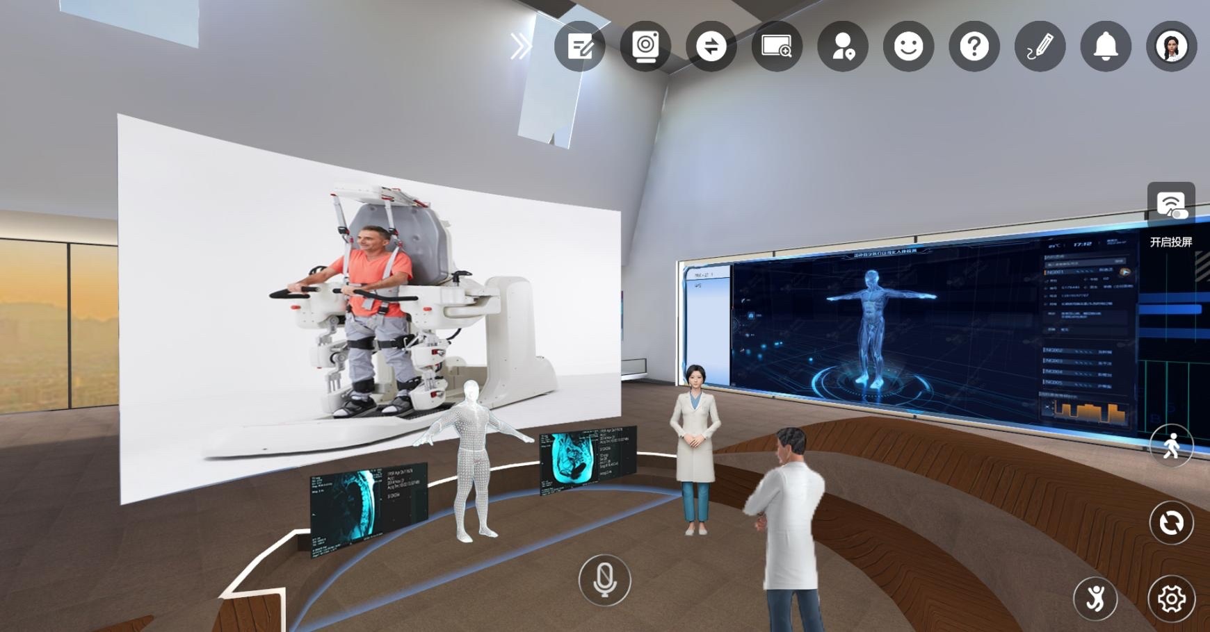 “就像推開一扇通往平行世界的門,這種‘在場感’是傳統(tǒng)遠程協(xié)作難以企及的。”維賽客首席運營官徐晨翔邊演示邊解釋道。他調(diào)出了VS·work中的“智聯(lián)康復元診療平臺”——這是維賽客在醫(yī)療元宇宙領域的創(chuàng)新應用,集成了病情診療、康復訓練、社交培訓等功能。在虛擬界面中,醫(yī)生可以通過高精度空間定位系統(tǒng)“走進”患者的虛擬診療室,患者則通過可穿戴設備完成肌力評估、平衡訓練等動作,數(shù)據(jù)實時反饋至醫(yī)生終端,為偏遠地區(qū)的患者提供了更加便捷、高效的診療服務。