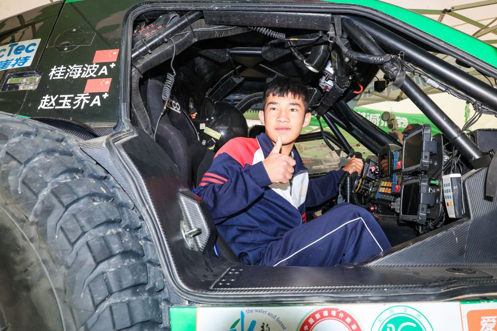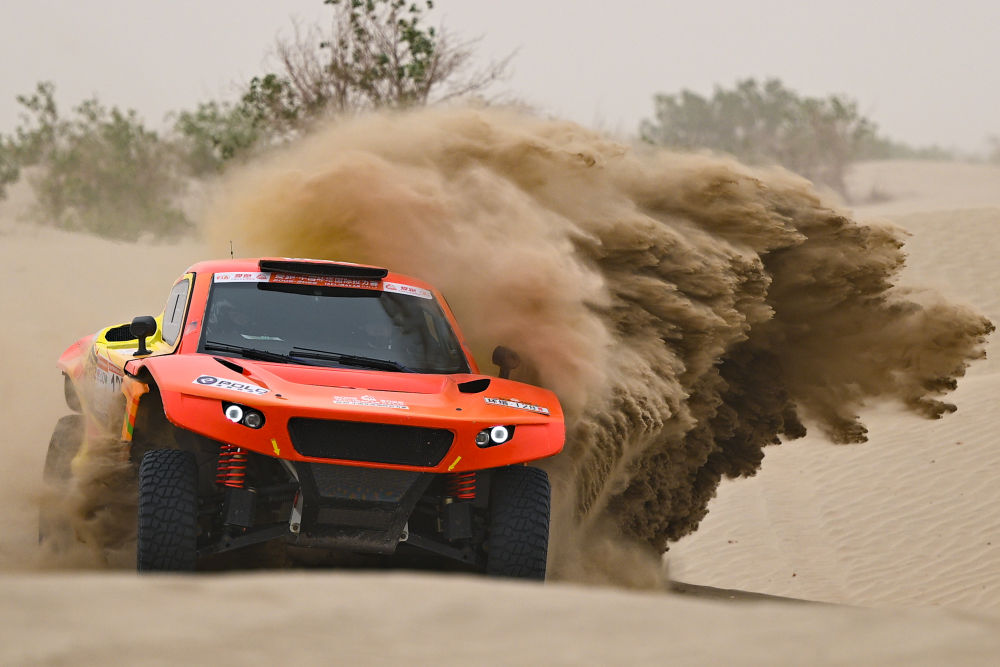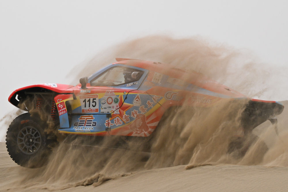 2025年5月31日,極道體育黑熊輪胎車隊(duì)車手趙善鵬、領(lǐng)航員郭峰在比賽中。新華社記者 辛悅衛(wèi) 攝