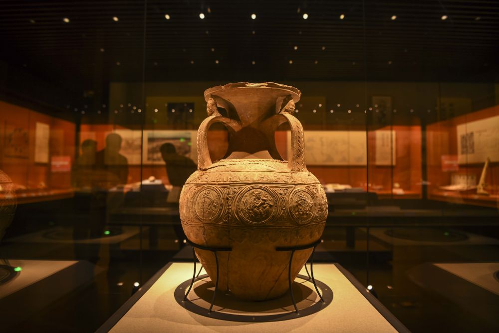 這是在新疆喀什地區(qū)博物館拍攝的國家一級(jí)文物“三耳壓花陶罐”(2023年6月12日攝)。新華社記者 胡虎虎 攝