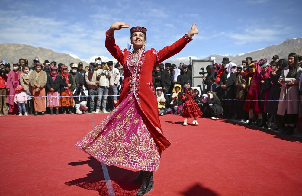 在新疆塔什庫爾干塔吉克自治縣提孜那甫鄉(xiāng)賽馬場(chǎng),參與非遺展演的村民在跳舞(2025年3月23日攝)。新華社記者 胡虎虎 攝