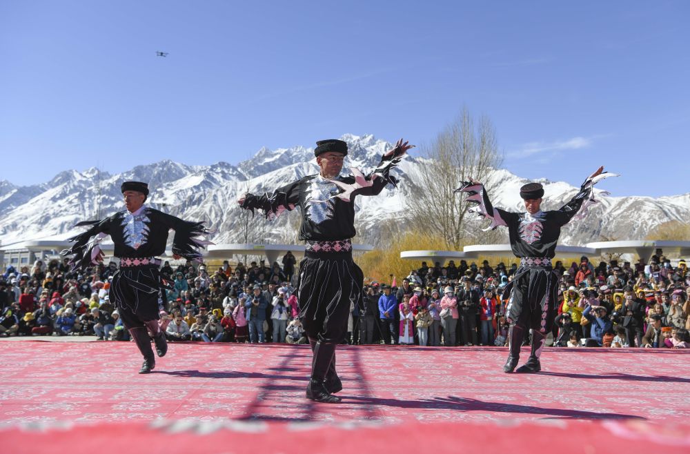在新疆塔什庫爾干塔吉克自治縣“彩云人家”民俗村,演員為觀眾表演國家級(jí)非物質(zhì)文化遺產(chǎn)——鷹舞(2025年3月22日攝)。新華社記者 胡虎虎 攝