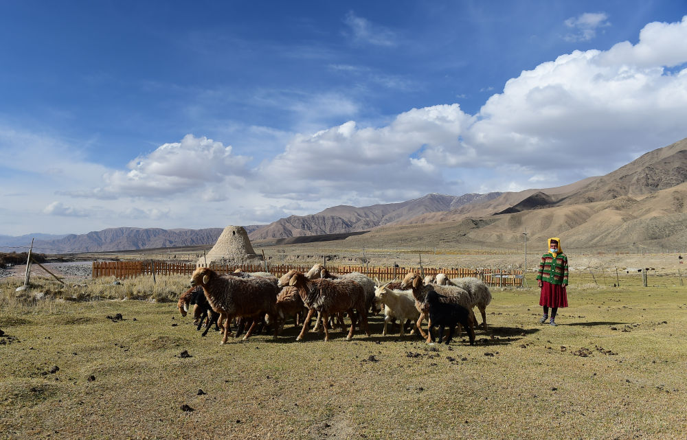 在新疆塔什庫爾干塔吉克自治縣,牧羊人在吉日尕勒文化遺址的亞爾特拱拜孜古驛站附近放牧(2021年5月3日攝)。新華社記者 侯昭康 攝