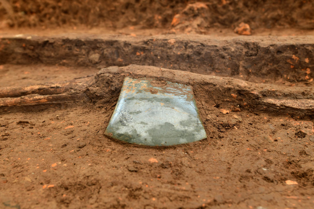 這是2022年12月10日在河南南陽(yáng)黃山遺址拍攝的屈家?guī)X文化高級(jí)別大型墓葬中隨葬的玉鉞。新華社發(fā)(陳輝 攝)