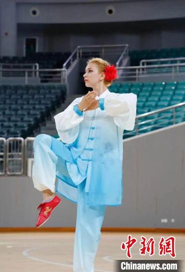 莎何娜斯身穿中國傳統(tǒng)服飾進行武術表演。湖州師范學院供圖