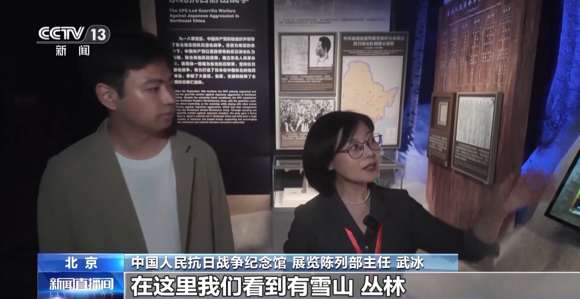 中國(guó)人民抗日戰(zhàn)爭(zhēng)紀(jì)念館 展覽陳列部主任 武冰:現(xiàn)在我們來(lái)到的這個(gè)空間就是東北抗聯(lián),在這里我們看到有雪山、叢林,在這里還增加了松樹(shù)的樹(shù)種,圖片、文物全部放置在了雪山當(dāng)中。觀(guān)眾在行進(jìn)過(guò)程當(dāng)中,會(huì)有一種破雪前行、歷史畫(huà)面慢慢地呈現(xiàn)出來(lái)的感受。像這樣的綜合性的景觀(guān)打造,在整個(gè)展覽當(dāng)中大概有十余處。
