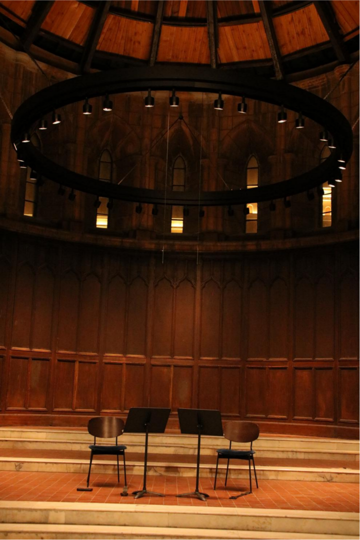 在原來祭臺的中間,現(xiàn)在改造為演講、演奏的環(huán)形中心臺。上方是一個中央環(huán)形燈,在沒亮燈之前就像一條烏黑色的緞帶,神秘且漂亮。